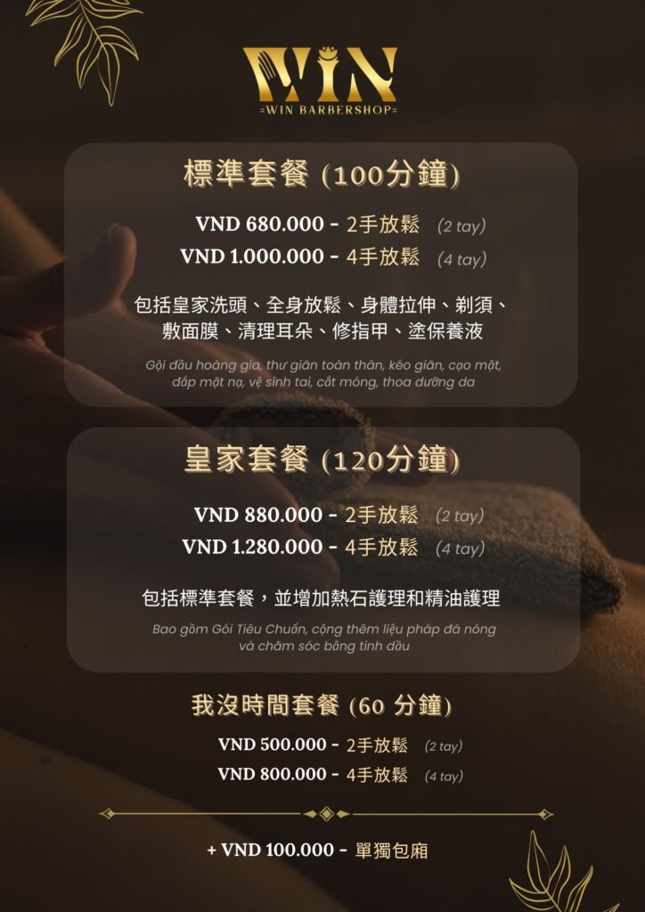 體驗胡志明市頂級的越式洗頭服務!無論是雙手或四手按摩,Win皇家套餐都能讓您煥然一新。立即預約,享受100分鐘的奢華放鬆之旅!